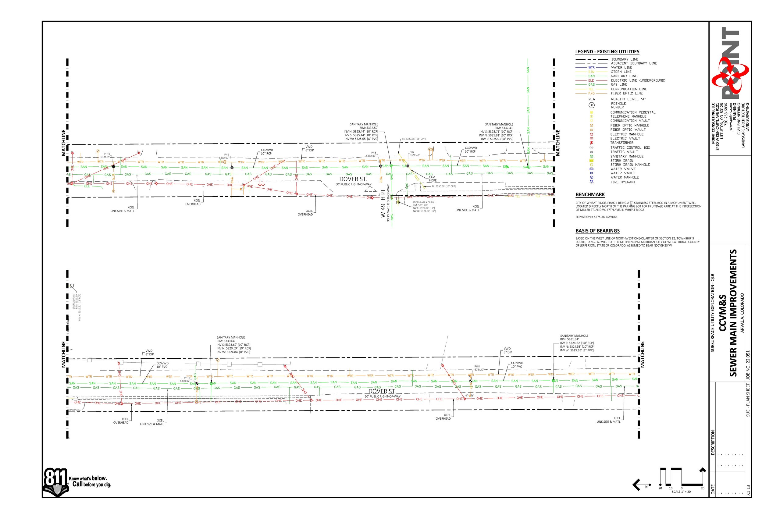 44th & Kipling, also known as Station Subdivision, is located at the northeast corner of 44th & Kipling in Wheat Ridge, Colorado. The project was initially provided a will-serve letter from the sanitary district that the development would connect to but as plans progressed Point and the Developer received notice from them that the outfall system was at capacity for approximately 1.5 miles downstream from the site. The District Engineer’s schedule didn’t meet the Station Subdivision desired timeline so Point jumped in and provided Subsurface Utility Engineering (SUE) for the 1.5 mile alignment. This included street topography, QLA (potholes) and QLB (surface marking) utility locates and full pipe as-builts of the existing system to be upsized.